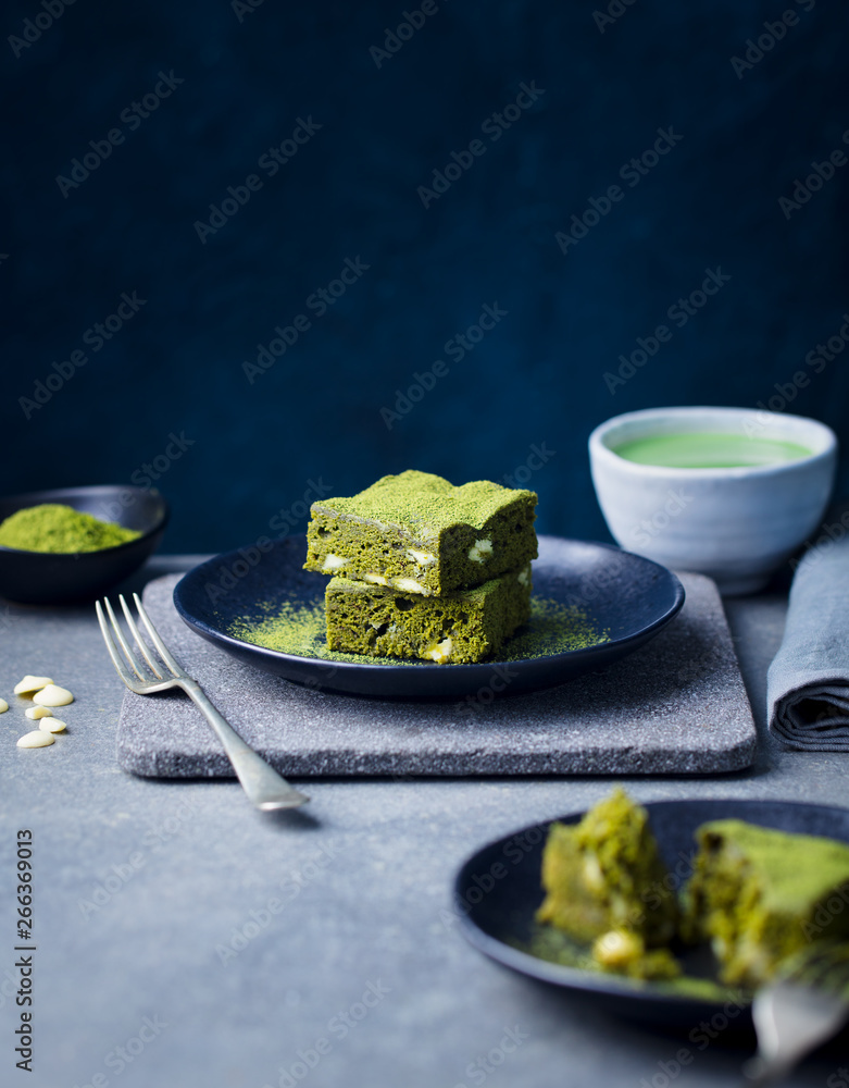 Matcha green tea cake, bars, brownie with white chocolate on a plate. Grey stone background. Copy space.