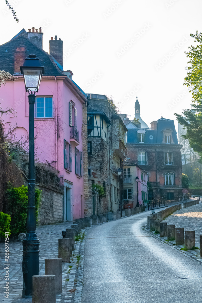 Paris, Montmartre, a very romantic parisian street with a vintage lamppost, sunrise, the Sacre-Coeur basilica in background