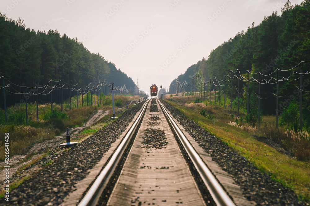 Mystic train travels by rail along forest. Railway traffic light and locomotive on railroad in distance. Mirage on railway track. Atmospheric landscape.