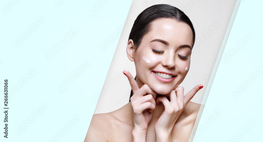 Portrait of model with natural nude make up with bare shoulders on gray background. Beautiful young woman with perfect glow clean skin applying moisturizer cream on her face.