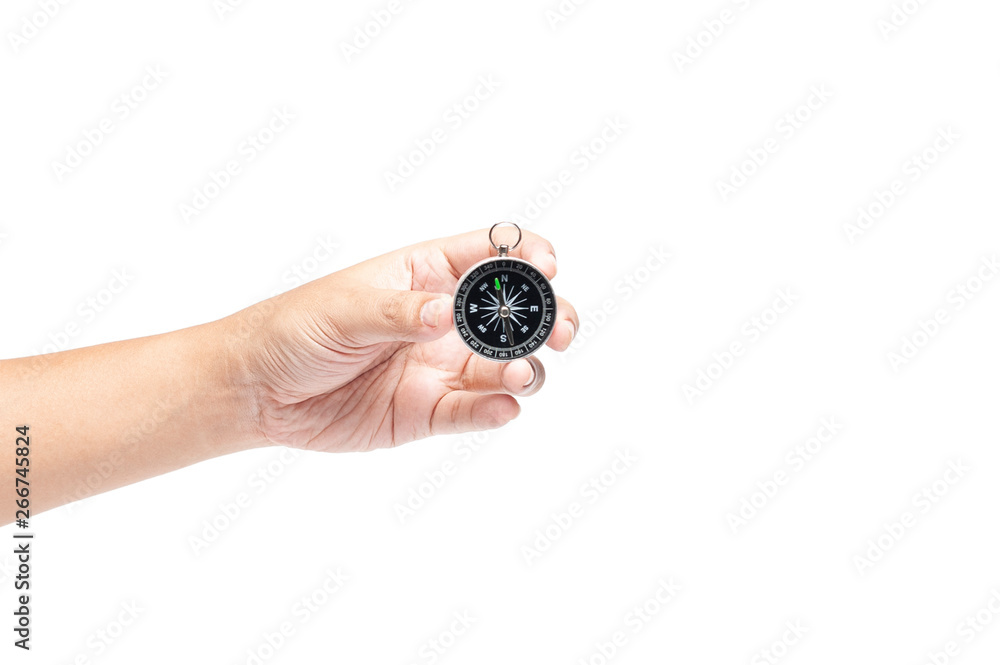Hand holding compass isolated on white background