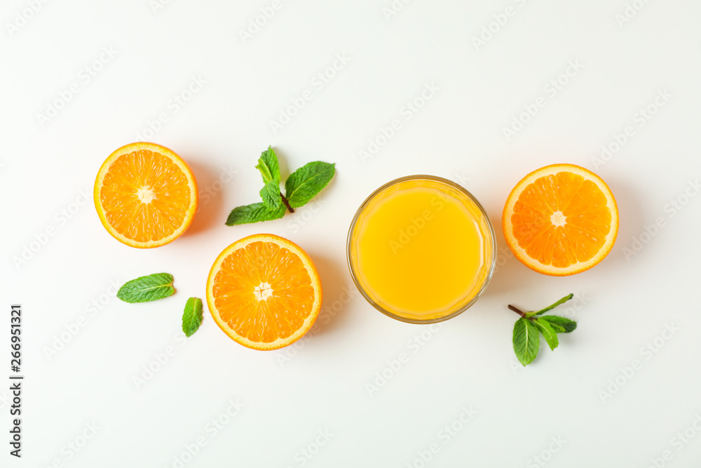 Flat lay composition with orange juice, oranges and mint on white background, space for text. Citrus drink and fruits