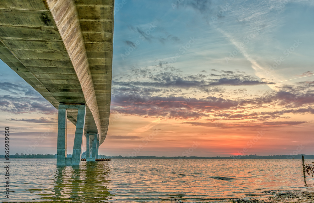 The Roskilde firth and Crown Princess Mary bridge at sunset