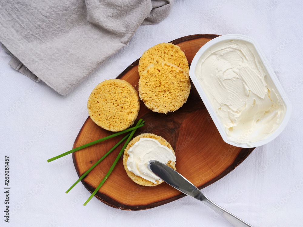Spreading cream cheese on a slice of keto almond flour bread