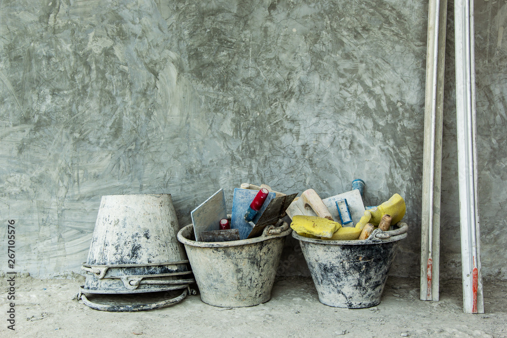 Plastering tools the concrete to build wall have Basket with Gyan plaster, trowel concrete plaster, sponge and Background gray surface wall bare cement skim coat loft style for interior or exterior.