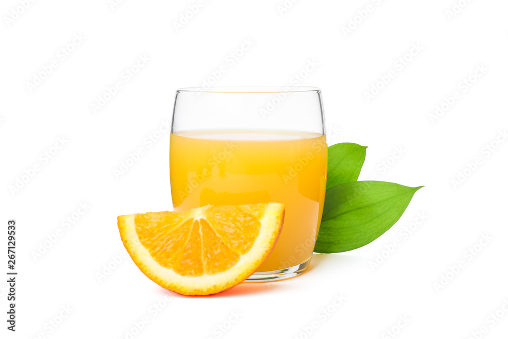 Glass of fresh orange juice with orange and leaves isolated on white background. Fresh natural drink
