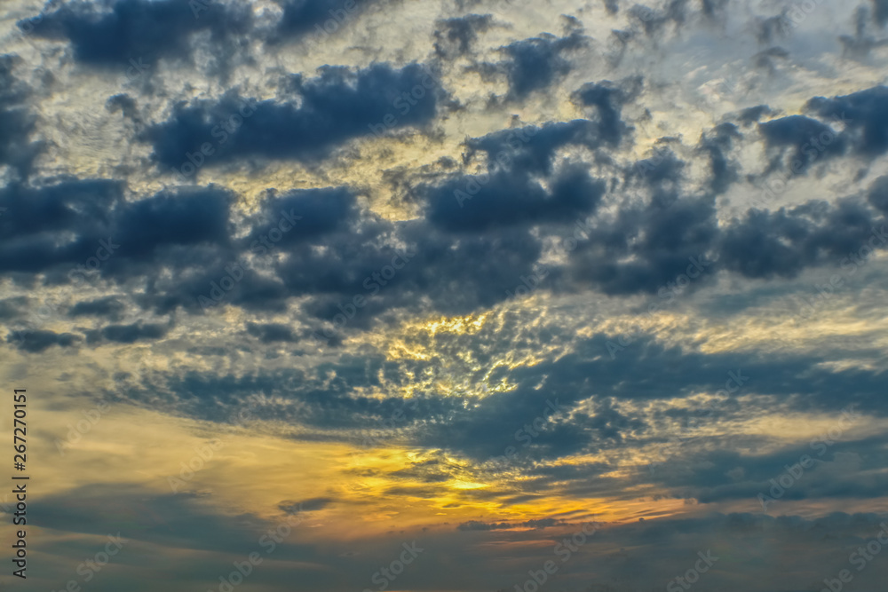 Yellow light spilling through dark puffy clouds at sunset - sky background