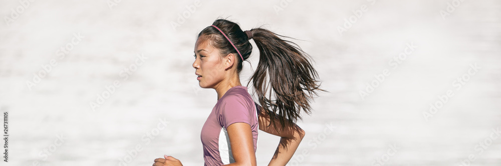 Run trail fitness sport athlete fit girl exercising doing outdoor workout in summer background, panoramic header.