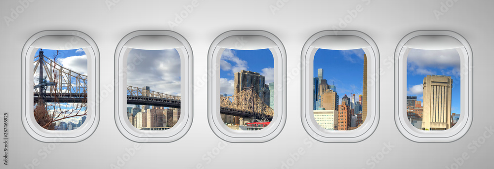 Queensboro Bridge in New York City as seen through five aircraft windows. Holiday and travel concept