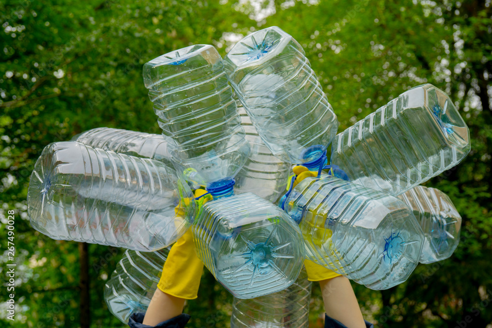 Garbage collection. Hands in yellow gloves holding big empty plastic bottles. Grass on a background.