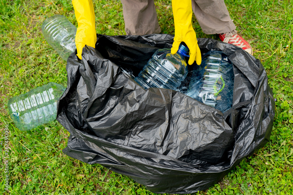 Separate garbage collection. Hands in yellow gloves putting big plastic bottles into bllack plastic trash bag.