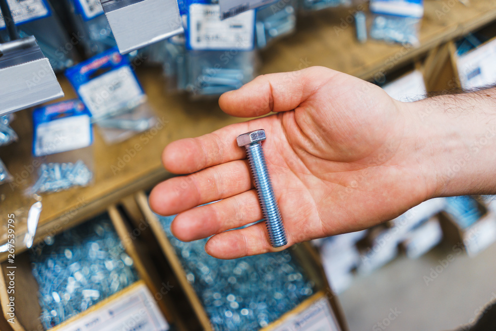 Man holds in his hands small screws for repair and fasteners in a box close-up.