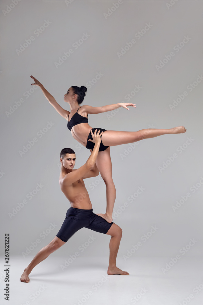 The couple of a young modern ballet dancers in black suits are posing over a gray studio background.