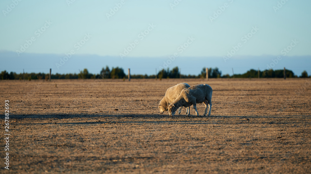 Two sheep grazing close together on an drought affected Australian farm in the low light of sunrise or sunset.