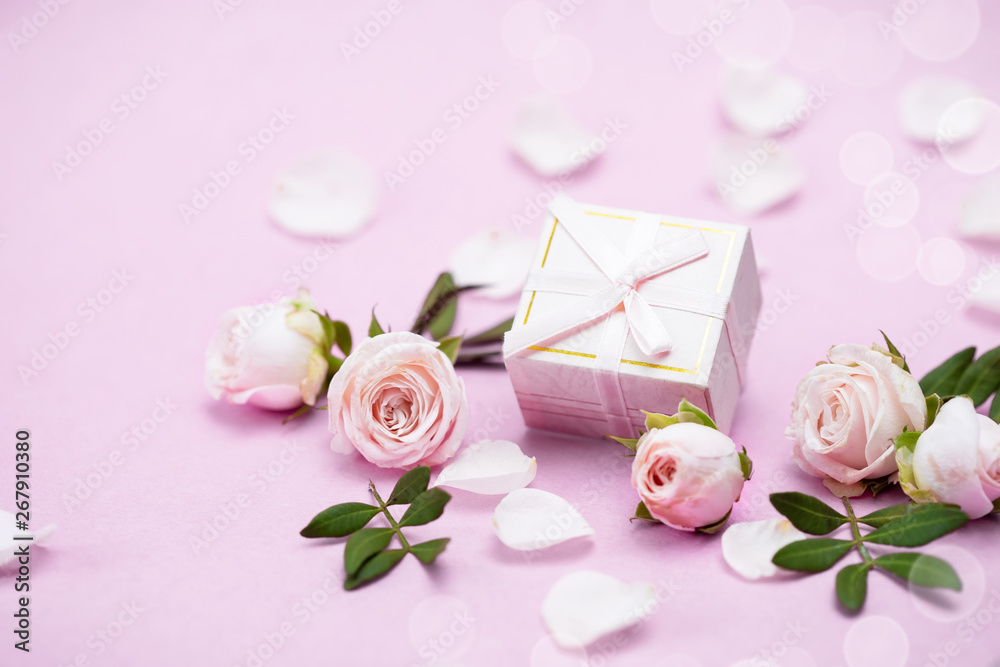 Rosebuds, petals,, gift box on a pink background. Concept for a greeting card. Weddings, Valentine's Day, Birthday