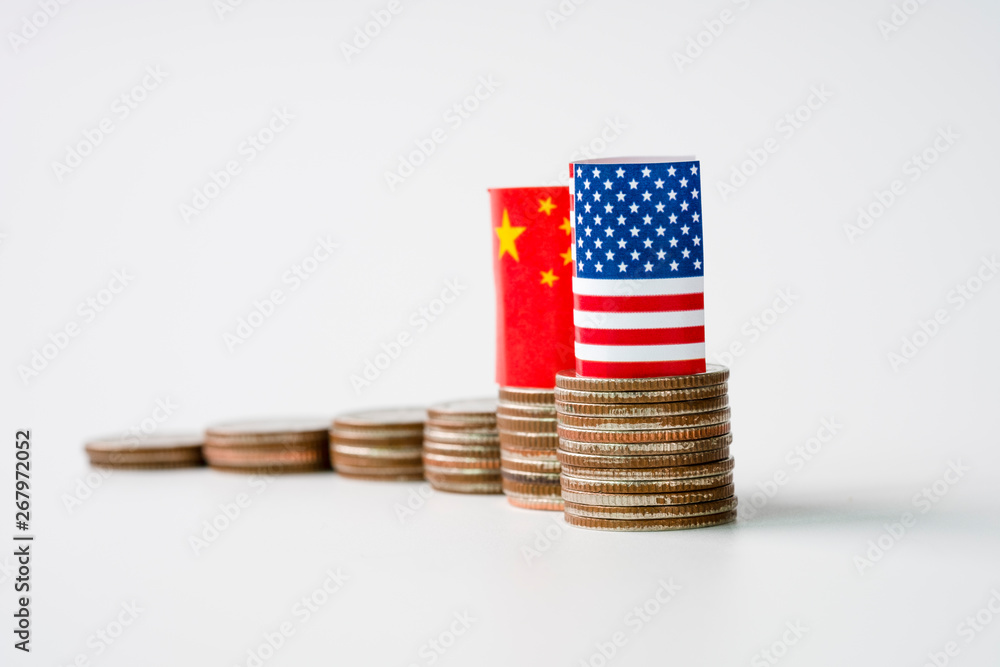 USA flag and China flag on coins stacking graph for tariff trade war between United States and China who conflict because of increase tax barrier of import and export product. Government and business.