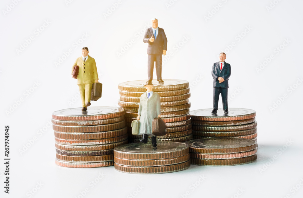 Miniature figure business man manager standing on glowing coins stack. Successful investor concept.