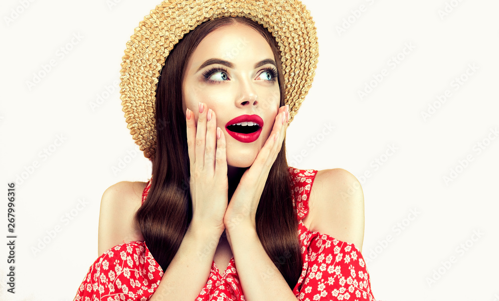 Shocked and surprised girl screaming covering mouth her hands.Woman in straw hat and summer dress amazed.Presenting your product.Expressive facial expressions emotions
