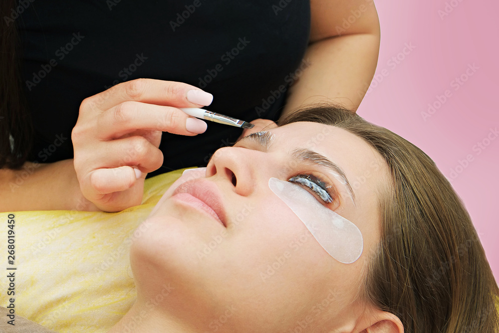 Eyelash Care Treatment Procedures: Staining, Curling, Laminating and Extension for Lashes. Beauty Model with Perfect Fresh Skin and Long Eyelashes. Skincare, Spa and Wellness. Close up.