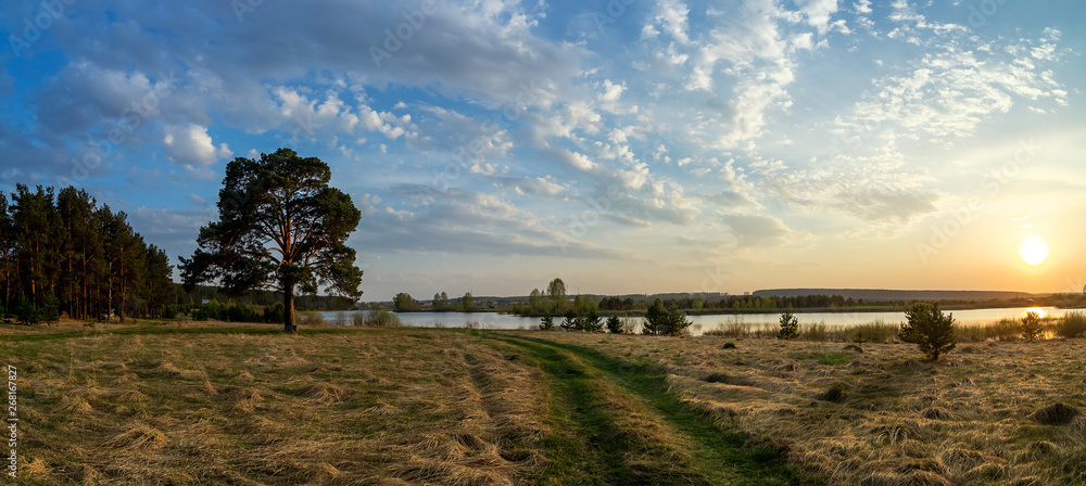 evening landscape with lush pine tree on the banks of the river and a dirt road, August