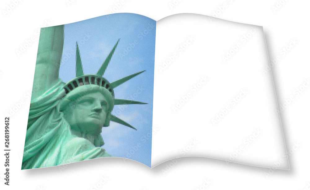 Statue of Liberty - New York City (USA) - 3D render concept image with copy space of an opened photo book with pixelation effect - I'm the copyright owner of the images used in this 3D render