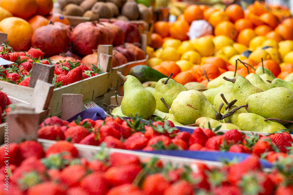 Fresh colorful fruit in wooden baskets ready for sale on the marketplace in Belgrade.