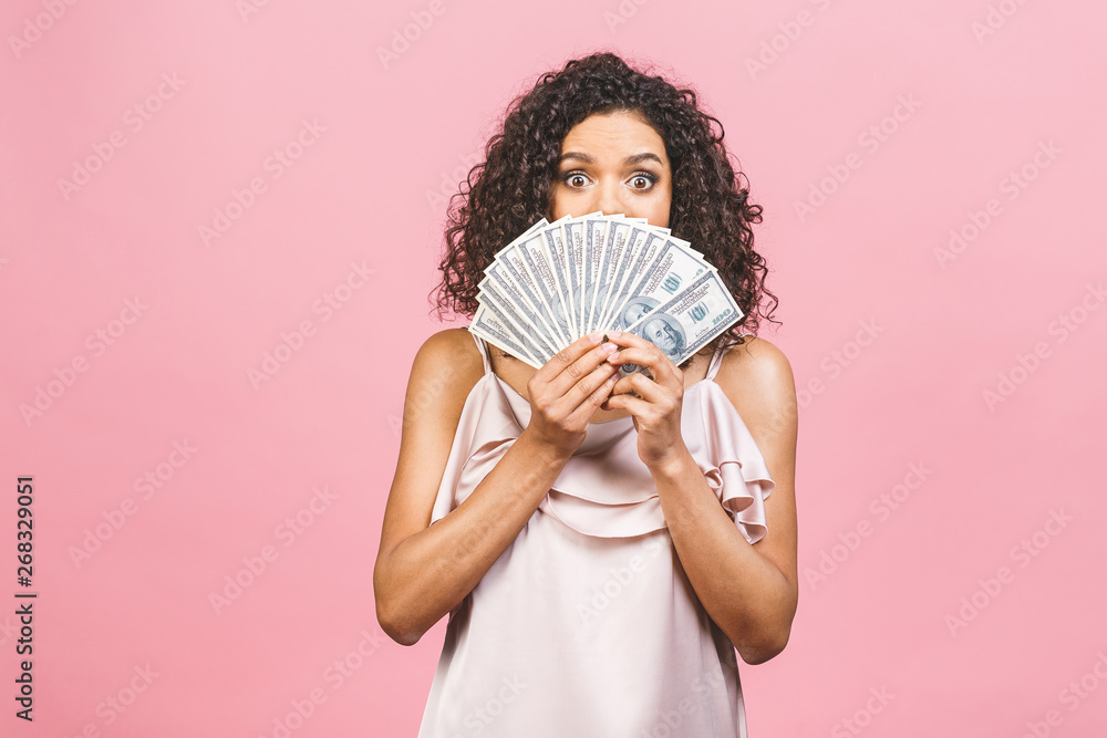 Rich girl! Money winner! Surprised beautiful african american woman in dress holding money and looking at the camera isolated against pink background.