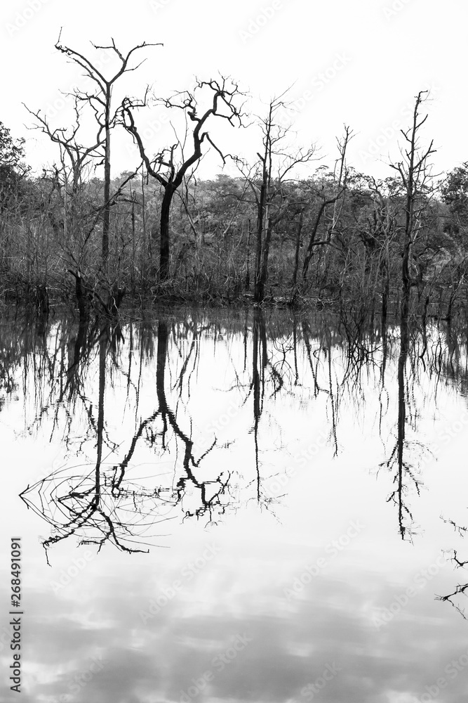 Abstract dead trees reflection on a lake.
