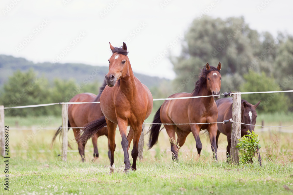 Reitpony Wallach läuft über eine grüne Weide; Herde im Hintergrund auf einer weiteren Weide