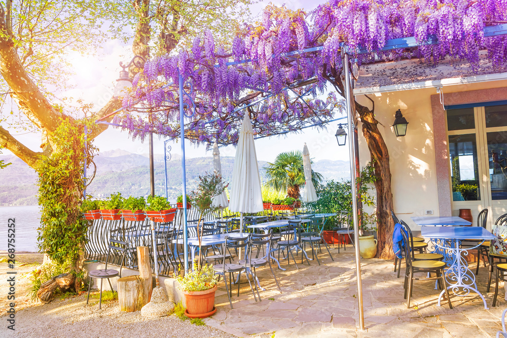 Terrace of outdoor small retro cafe decorated with flowers of wisteria on the Italian coast in a sunny spring evening. Lake Lago Maggiore in Stresa, Italy