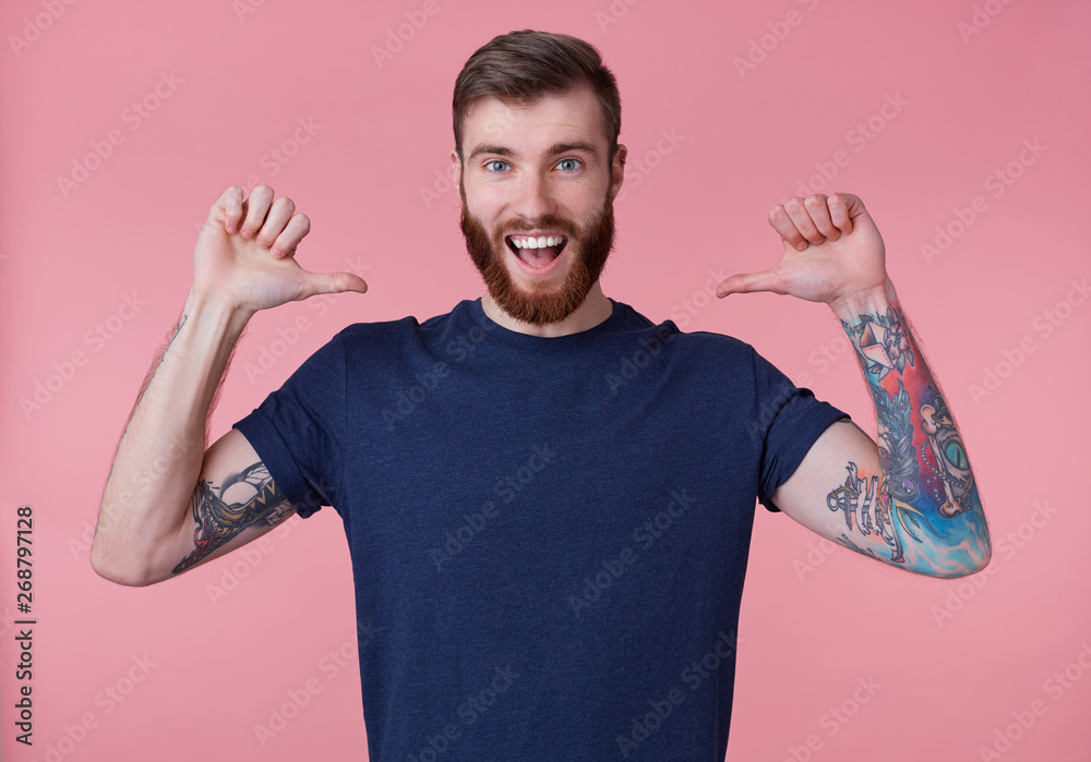 Portrait of young happy attractive red-bearded young guy , wearing a blue t-shirt, broadly smiling, enjoy himself, with arms raised up and pointing fingers at himself isolated over pink background.