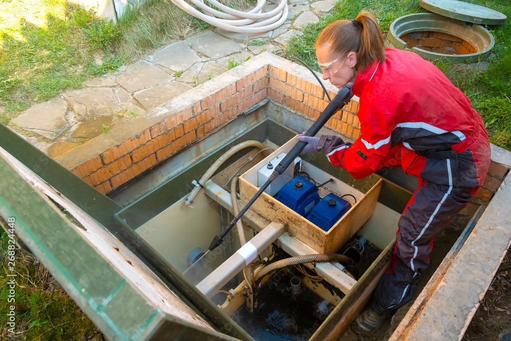plumber cleans a septic tank using car wash high pressure. Purification station. Sewage treatment plant.