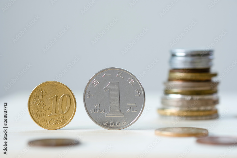Face to face of USA dollar coin and China yuan coin for tariff trade war and tech war between United States and China who conflict because of increase tax barrier of import and export product.
