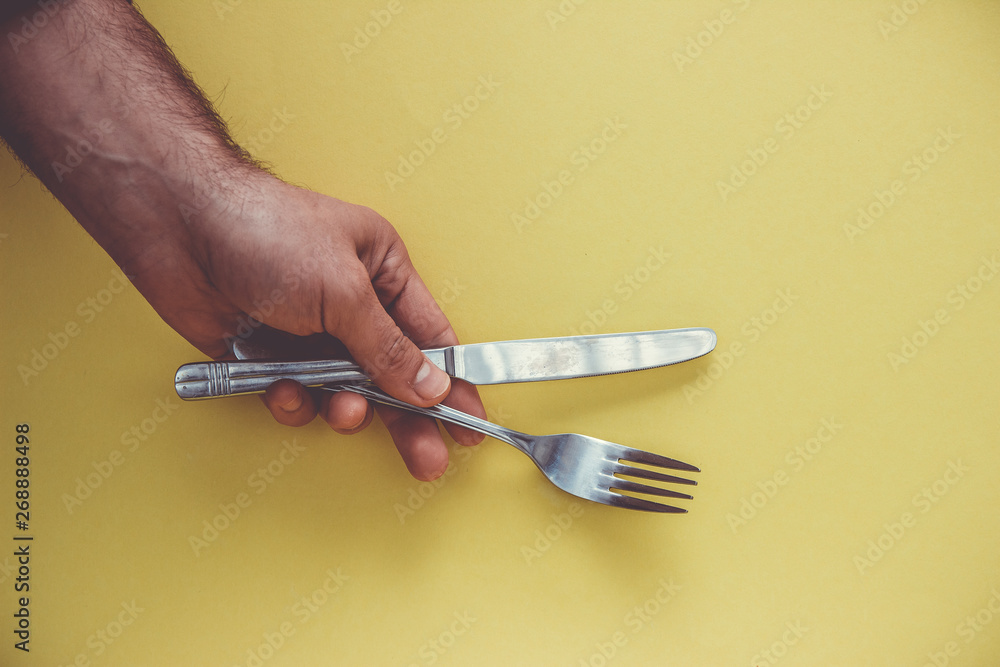 Hand with knife and fork on a yellow background.