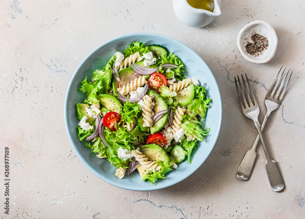 Mediterranean pasta avocado salad on a light background, top view. Vegetarian diet food concept