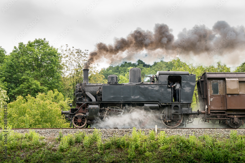 Vintage steam train with ancient locomotive and old carriages runs on the tracks in the countryside