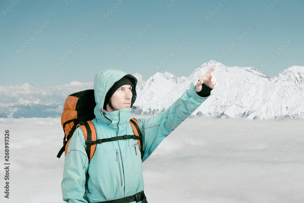 Portrait of adventurous young man on winter mountain top view pointing out. Active lifestyle and tourism.