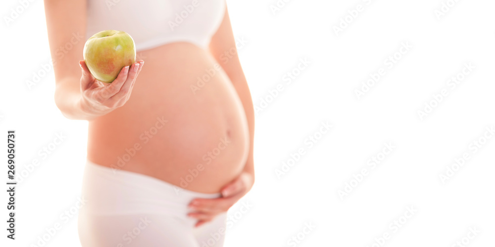 Image of pregnant woman touching her big belly and holding apple in the hand isolated on white background. Close up. Beautiful body of pregnant woman. Motherhood, pregnancy concept.