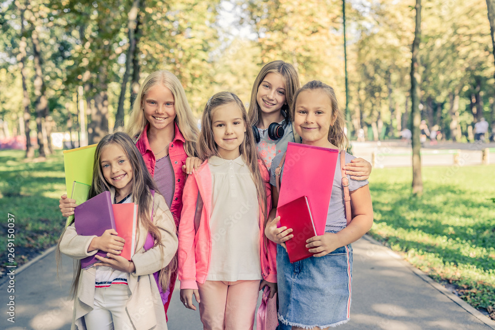 Pretty smiling little girls holding notebooks and stand together in the sunshine park