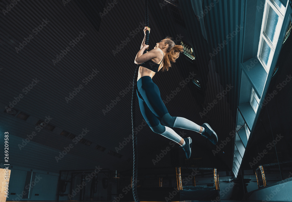 Full length wide angle shot of a woman performing rope climbs at the gym. Copyspace background with athletics healthy composition. Crossfit and fitness