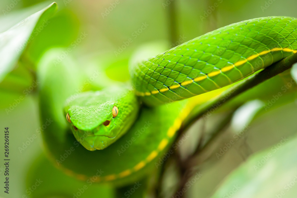 Close-up Vogel’s Green Pit Viper in the wild tree.