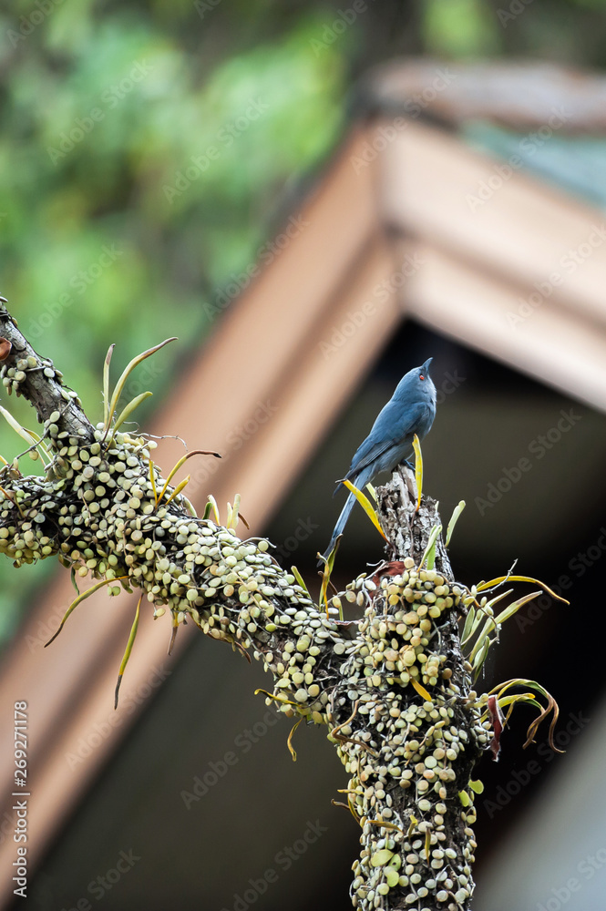 Ashy Drongo is perching on the branch of tree in front of a woodside cottage.