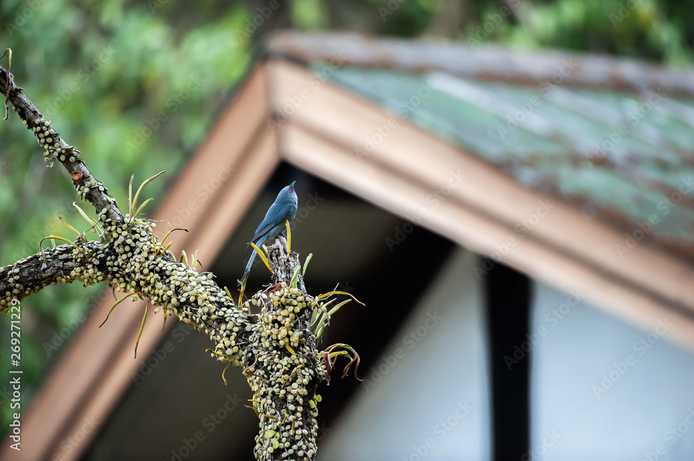 Ashy Drongo is perching on the branch of tree in front of a woodside cottage.