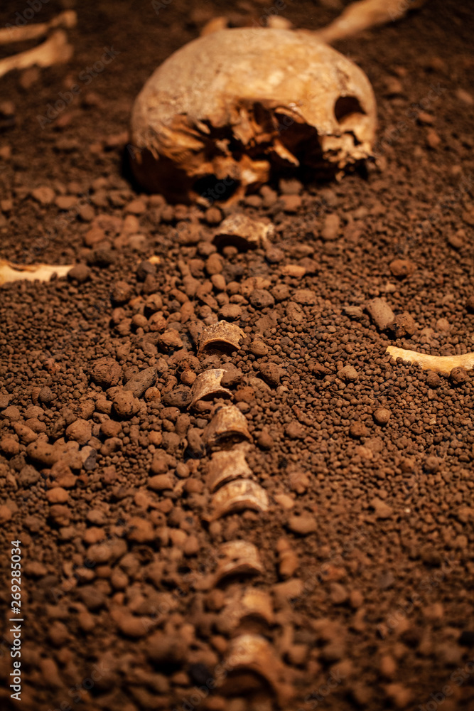 Skull and bones digged from pit in the scary graveyard which has dim light. Still life and art image