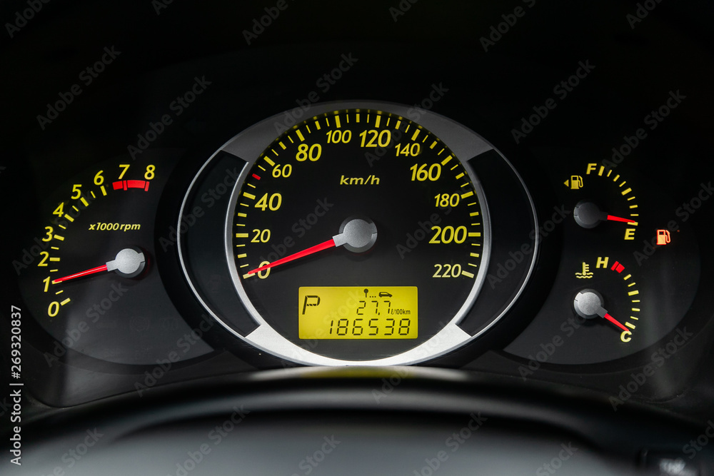 Сlose-up of the car black interior: dashboard, speedometer and tachometer with green backlight and other buttons.