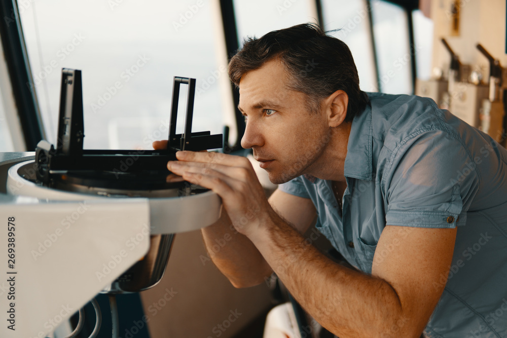 Marine deck officer taking magnetic compass error onboard of vessel at open sea. Job at sea