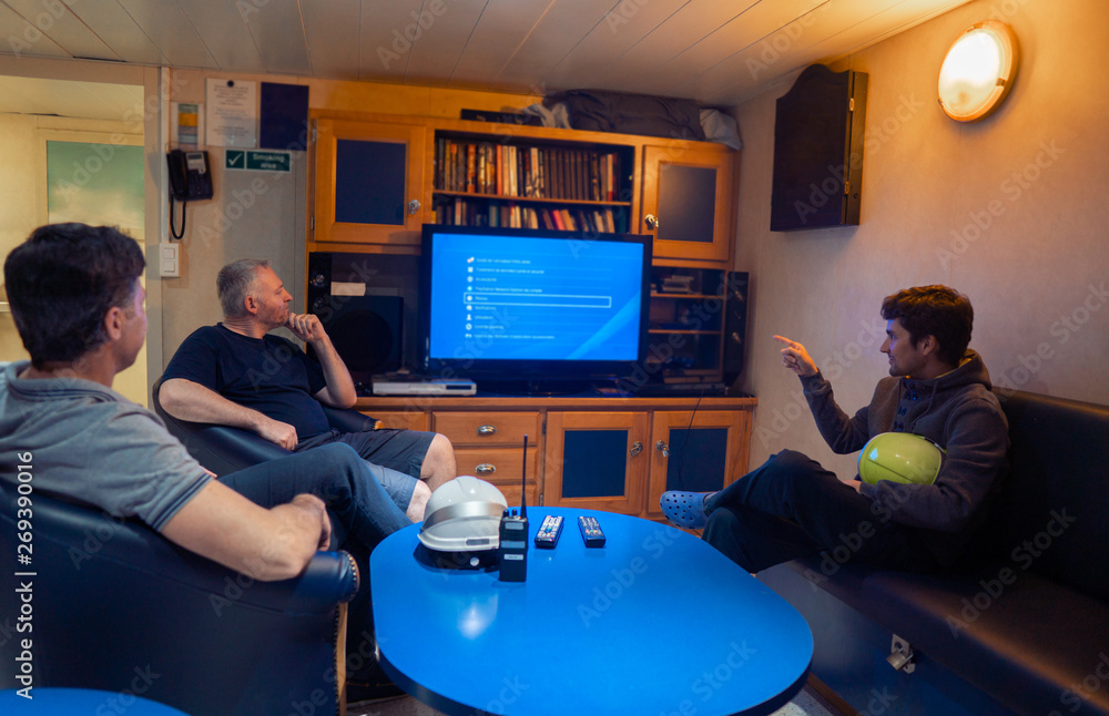 Happy team of ship officers watch TV onboard of vessel. TV, recreation and internet at sea