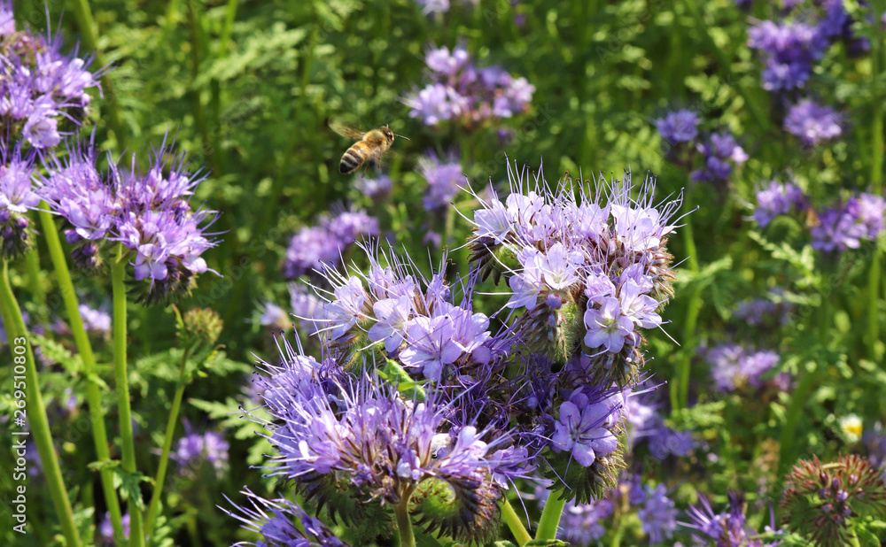flying honey bee in a blue blooming phacelia field