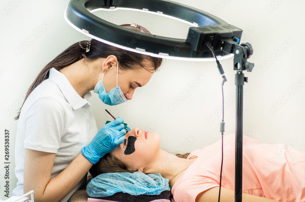 Eyelash lamination procedure. Staining, curling, laminating, lash lift. Eyelash Extension. Lengthening lashes for girl in beauty salon. Beauty Concept.
