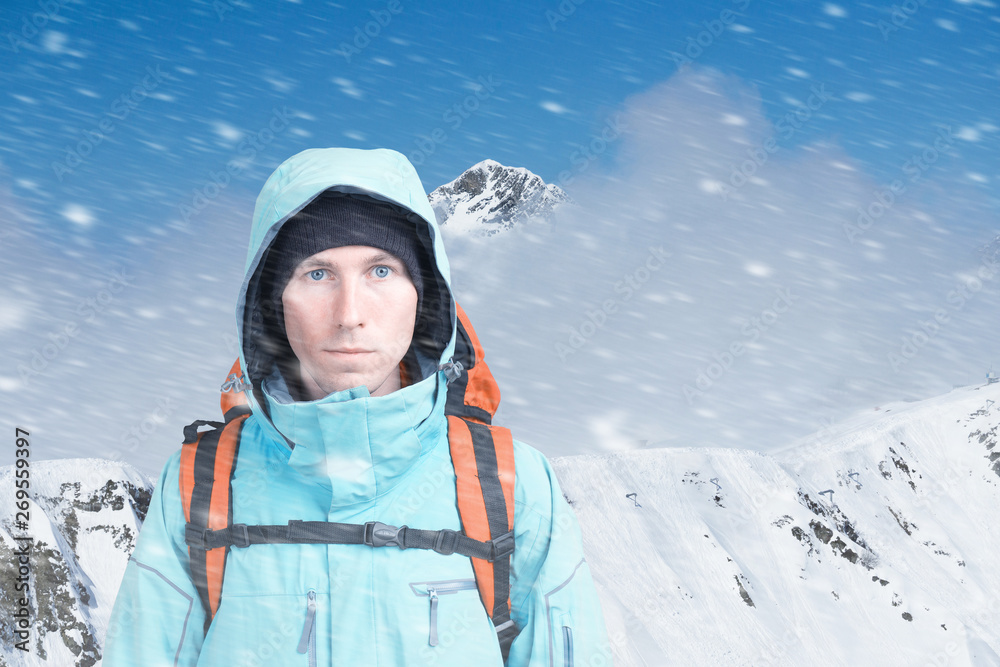 Young male mountain climber on winter mountain top view looking at camera. Front view. Active lifestyle and tourism in cold weather. Winter mountain landscape and cloudy sky.